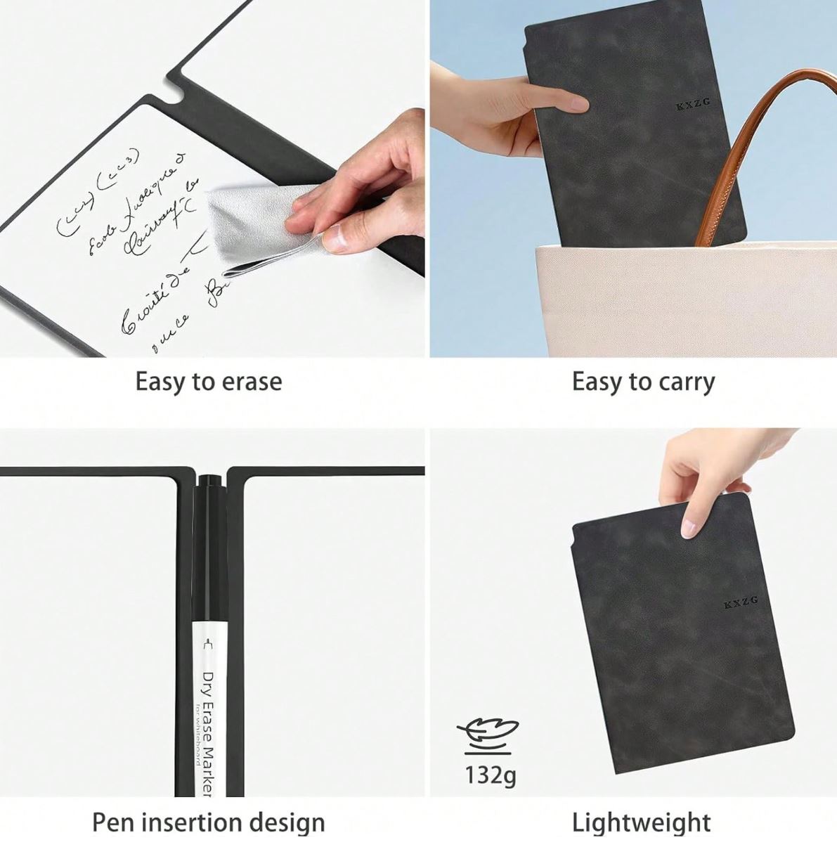 Material/Design: This stylish A5 notebook features a leather cover and a reusable whiteboard surface, making it both elegant and functional. The set includes a dry-erase marker and an erasing cloth for easy updates.