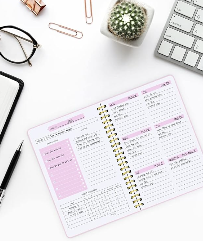 Features: Designed with undated weekly and daily layouts, this notebook allows flexible planning at any time of the year. It includes sections for to-do lists, daily tracking, and productivity planning, helping users organize tasks, goals, and schedules efficiently.